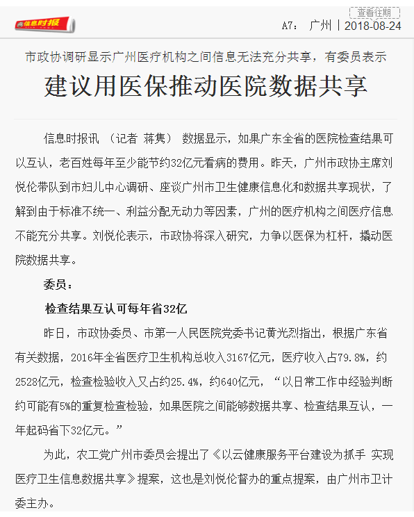 《信息时报》:建议用医保推动医院数据共享 2018年8月24日A07版