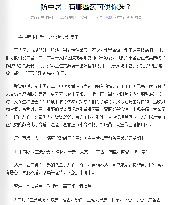 《羊城晚报》:防中暑,有哪些药可供你选? 2018年7月17日A20版