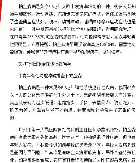 《广州日报》:性功能障碍或是帕金森病早期信号 2018年4月9日A18版