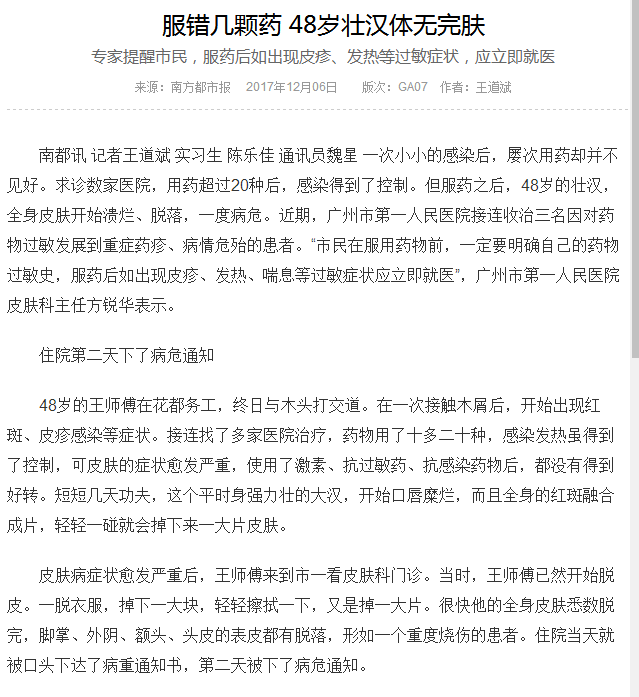 《南方都市报》:服错几颗药 48岁壮汉体无完肤 2017年12月6日GA07版