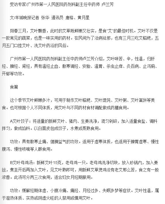 《羊城晚报》:健脾益气,食“艾”有方 2017年3月25日B8版