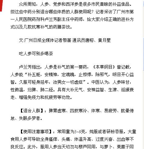 《广州日报》:抵御”倒春寒“,人参、西洋参、党参该怎样吃? 2017年2月20日A30版