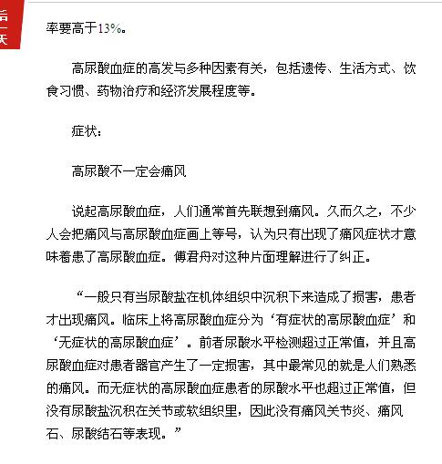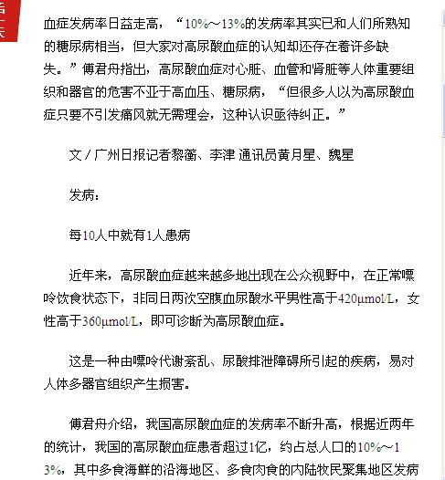 《广州日报》:高尿酸血症 没有痛风症状更可怕 2017年2月8日A17版