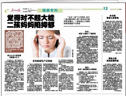 《广州日报》:觉得对不起大娃 二孩妈妈陷抑郁 2017年2月6日A13版