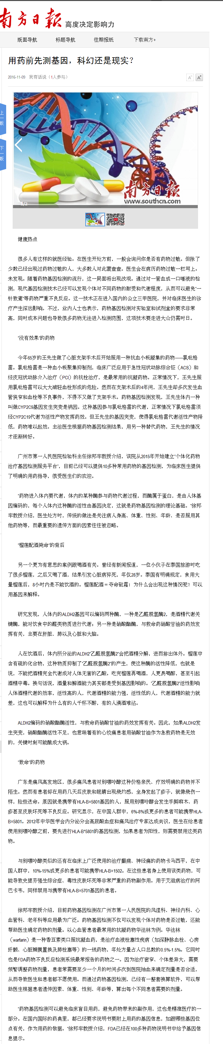 《南方日报》:用药前先测基因,科幻还是现实? 2016年11月9日B01版