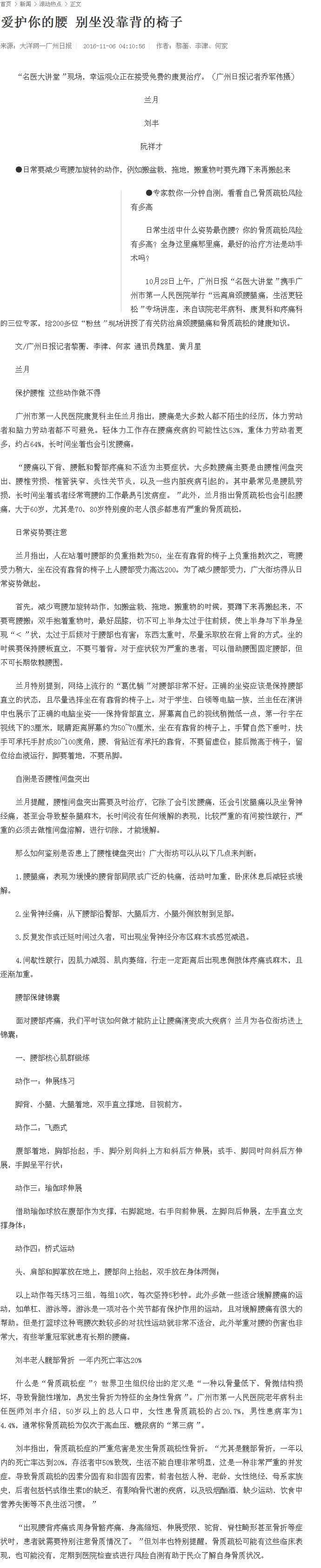 《广州日报》:爱护你的腰 别坐没靠背的椅子 2016年11月6日
