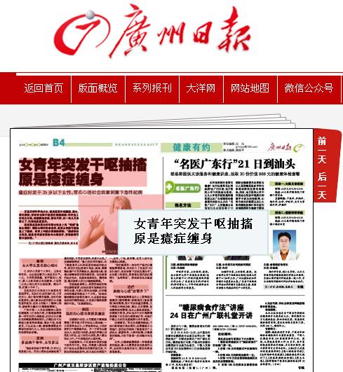 《广州日报》:女青年突发干呕抽搐 原是癔症缠身 2016年10月20日B4版