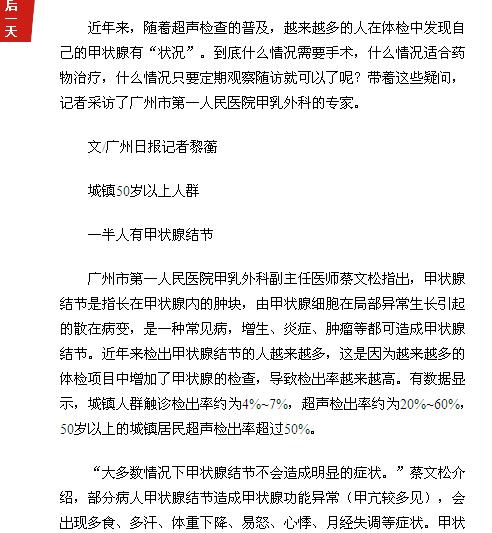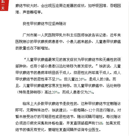 《广州日报》:儿童甲状腺结节 恶性率是成人5倍 2016年6月21日B4版