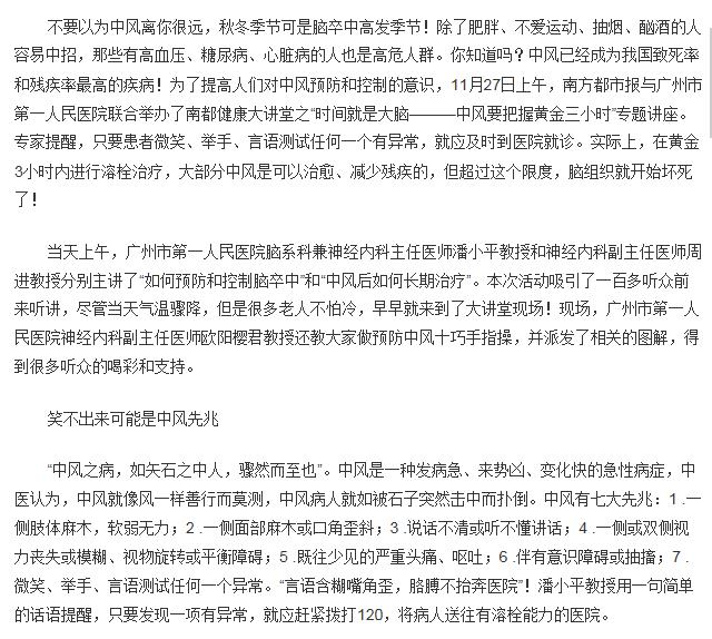 《南方都市报》:言语含糊嘴角歪 胳膊不抬奔医院 2015年12月7日GS04版