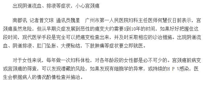 《南方都市报》:出现阴道流血、排液等症状,小心宫颈癌 2015年8月24日GS08版