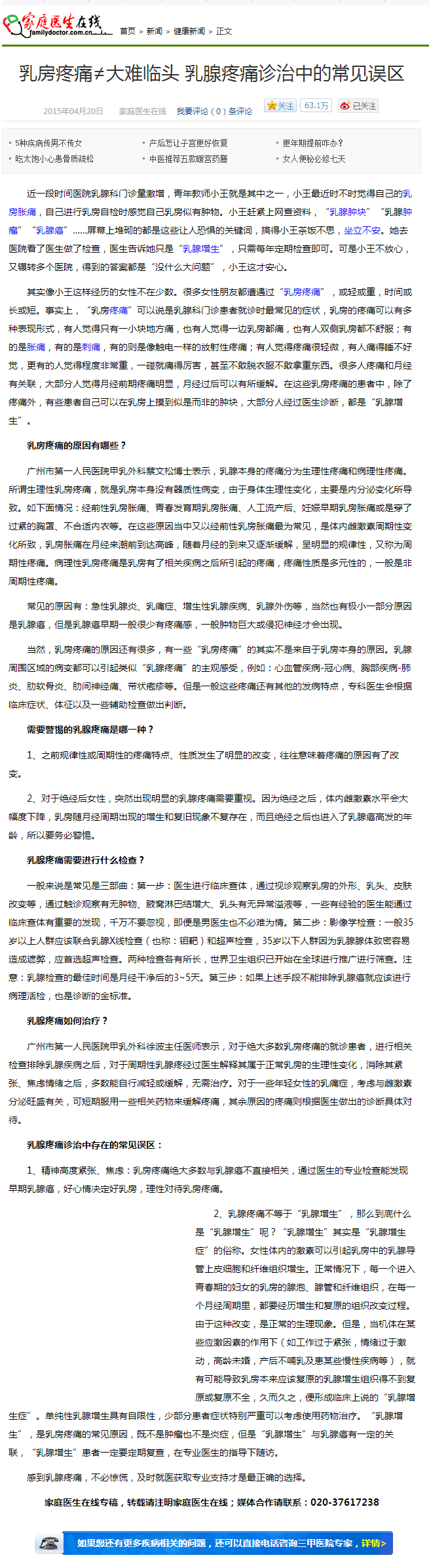 【家庭医生在线】乳房疼痛≠大难临头 乳腺疼痛诊治中的常见误区 2015年4月20日新闻