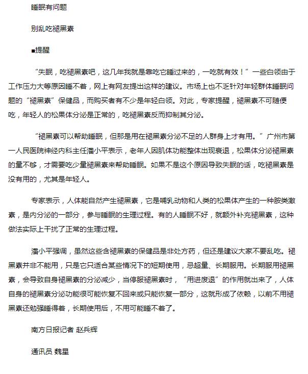 《南方日报》:睡眠有问题 别乱吃褪黑素 2015年4月7日B01版