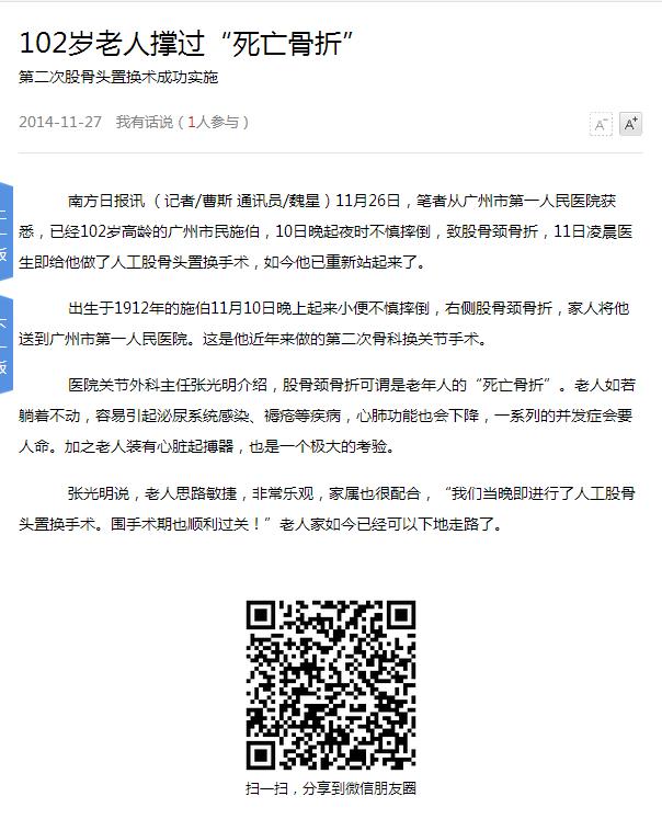 《南方日报》:102岁老人撑过“死亡骨折” 2014年11月27日AII08版