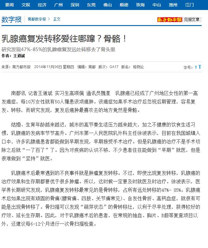《南方都市报》:乳腺癌复发转移爱往哪蹿?骨骼! 2014年11月6日GA17版