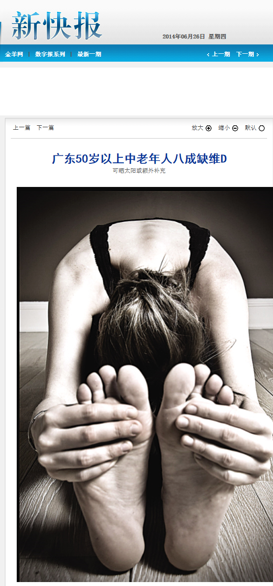 《新快报》:广东50岁以上中老年人八成缺维D 2014年6月26日D07版