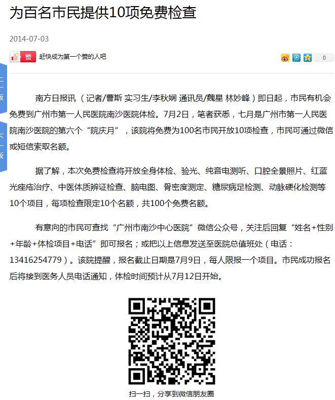 《南方日报》:为百名市民提供10项免费检查 2014年7月3日GC05版