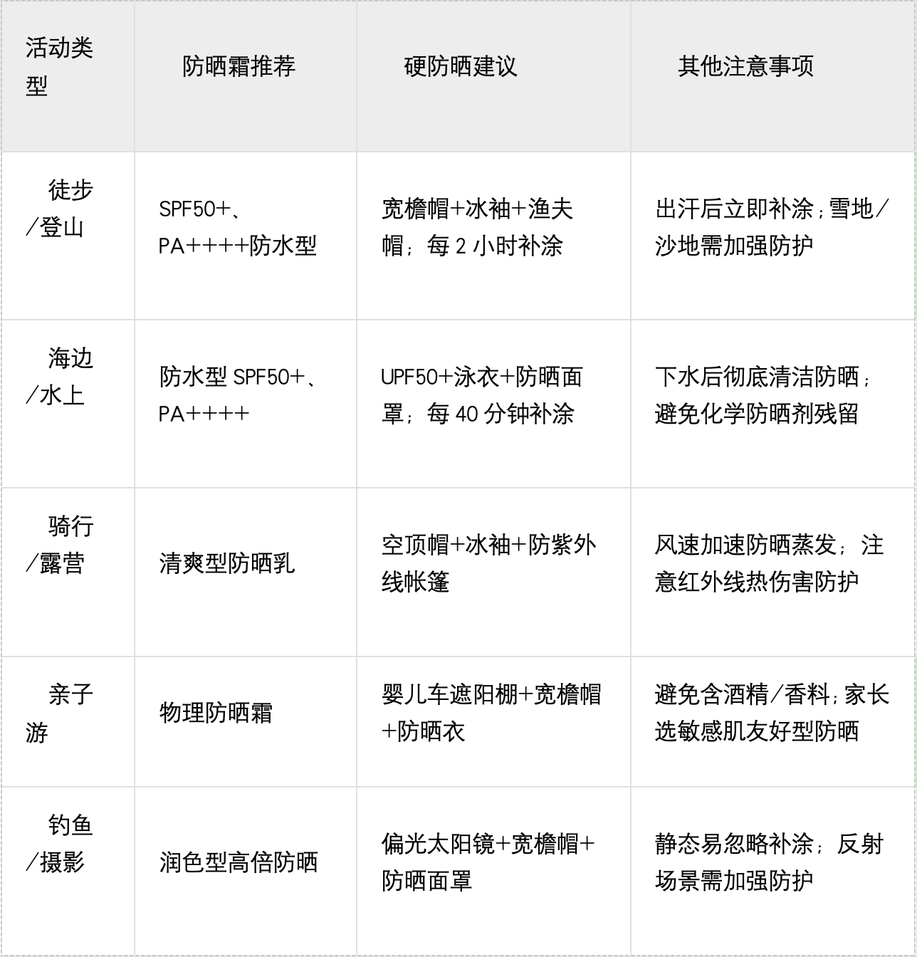 在硬防晒工具上,可选择宽檐帽、UPF50+防晒衣、冰袖、遮阳伞(遮挡率≥95%)。