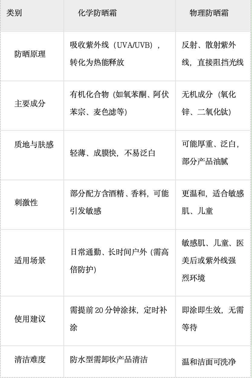 一个表格教你区分物理防晒和化学防晒的区别