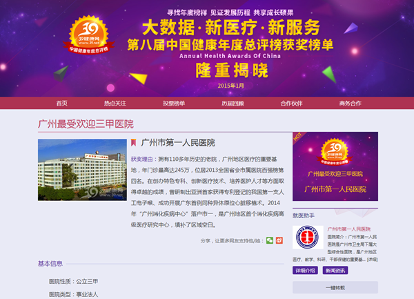 被誉为“中国健康行业风向标”的第八届中国健康年度总评榜榜单近日正式发布,我院荣获广州"最受欢迎三甲医院"称号。 本届总评榜以“大数据 新医疗 新服务”为主题,...