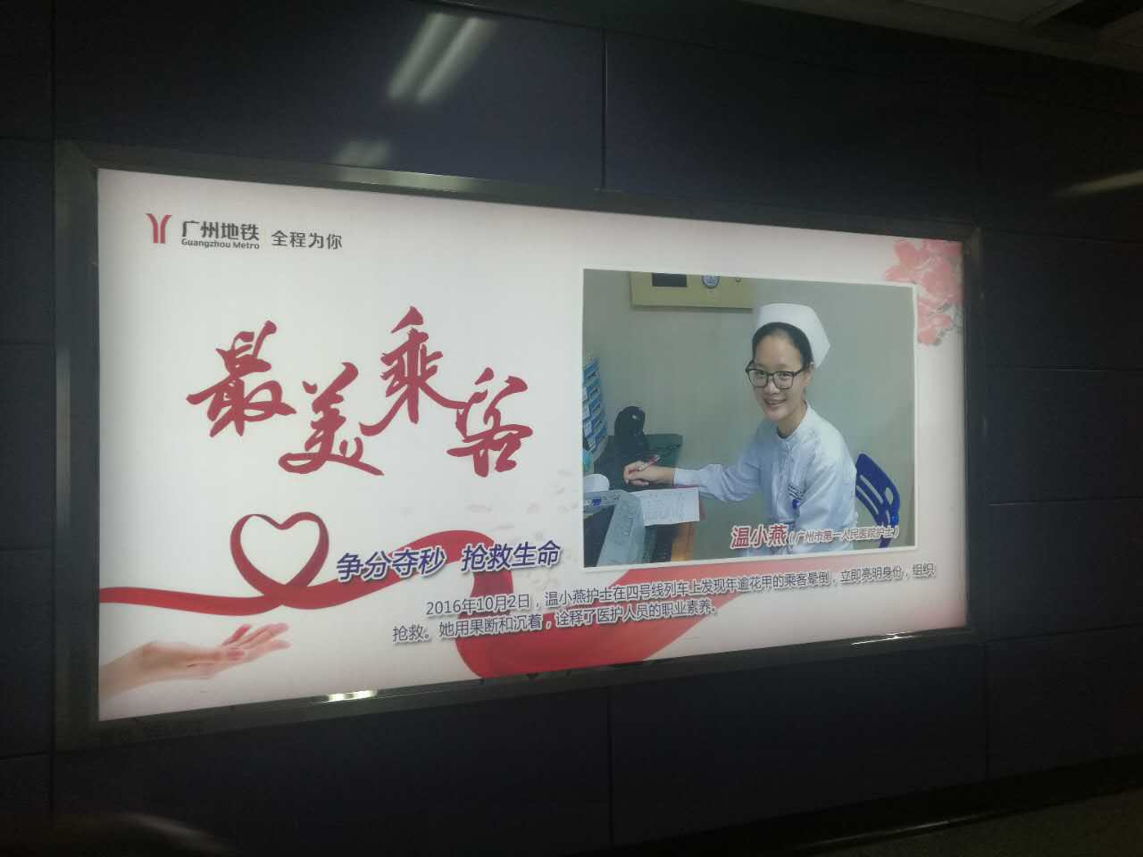 近日,在广州地铁公布的2016年9位“最美地铁乘客”中,我院泌尿外科护士温小燕因去年10月2日在广州地铁四号线金洲站挺身而出救助一名晕倒的乘客,获评“最美乘客”。 地铁站的灯箱宣传 在广州地铁灯...