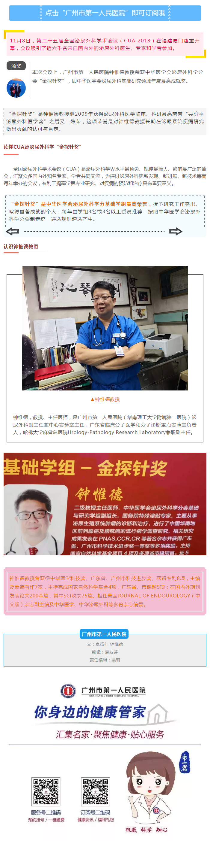 广州市第一人民医院钟惟德教授荣获泌尿外科学“金探针奖”