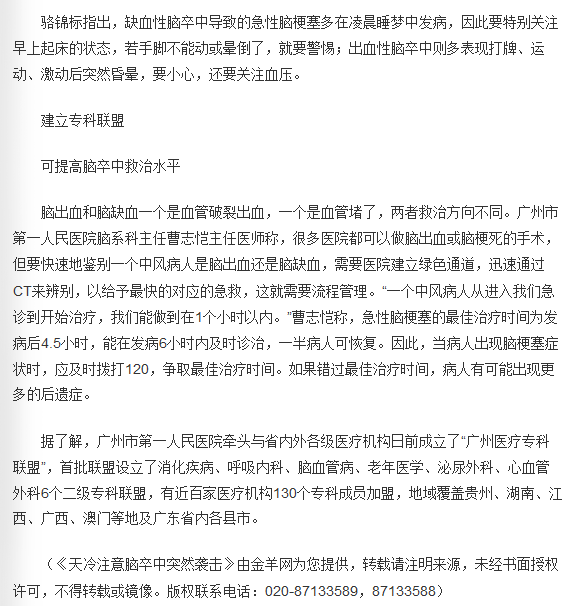 《新快报》:天冷注意脑卒中突然袭击 2017年11月28日A26版