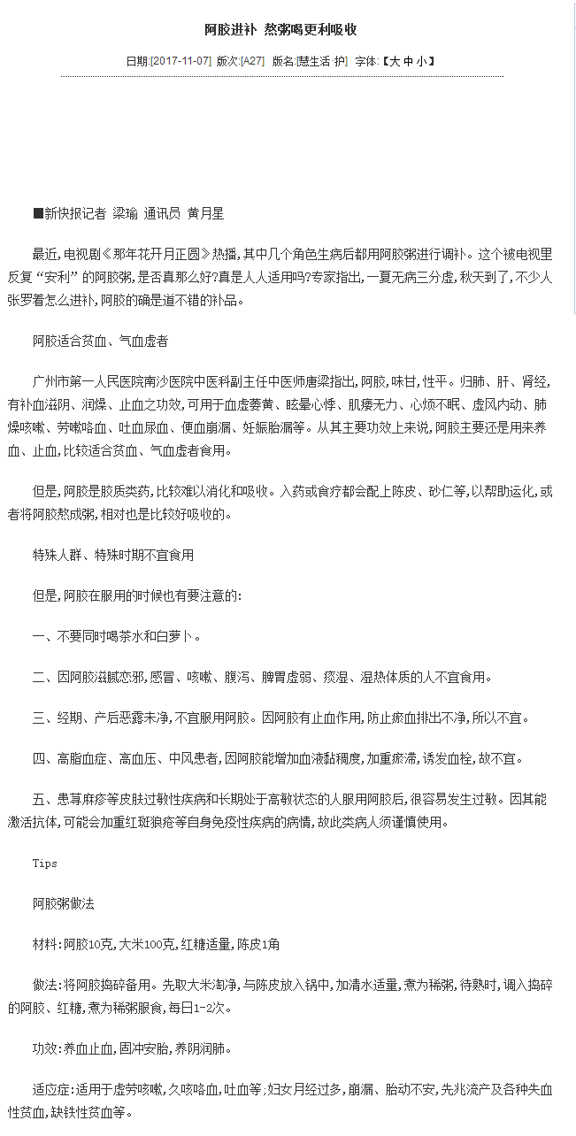 《新快报》:阿胶进补,熬粥喝更利吸收 2017年11月7日A27版