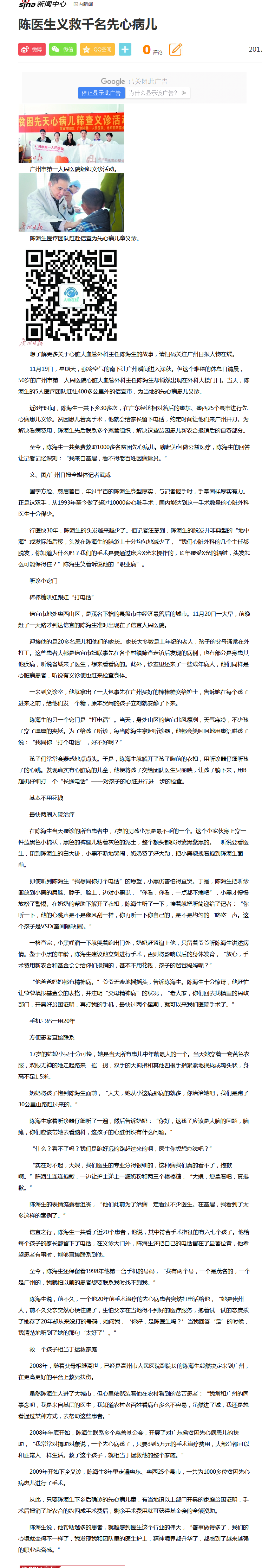 《广州日报》:陈医生义救千名先心病儿 2017年11月28日A9版
