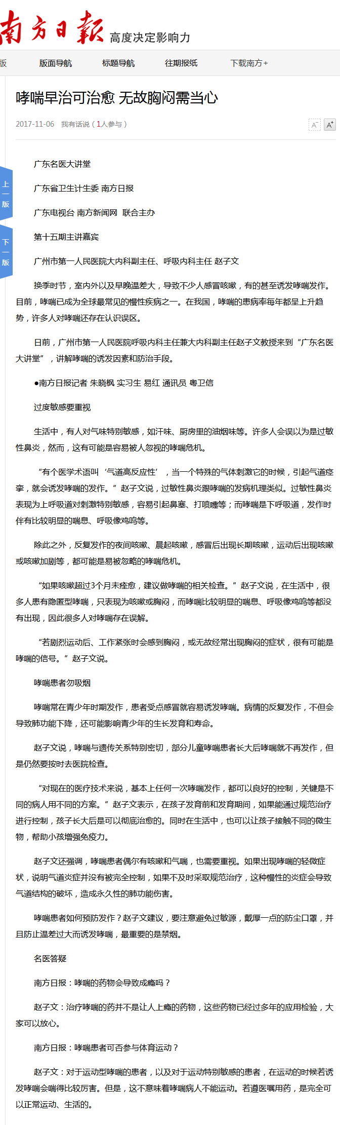 《南方日报》:哮喘早治可治愈 无故胸闷需当心 2017年11月6日A07版
