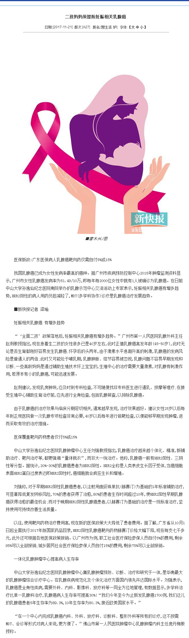 《新快报》:二孩妈妈须提防妊娠相关乳房癌 2017年11月21日A27版