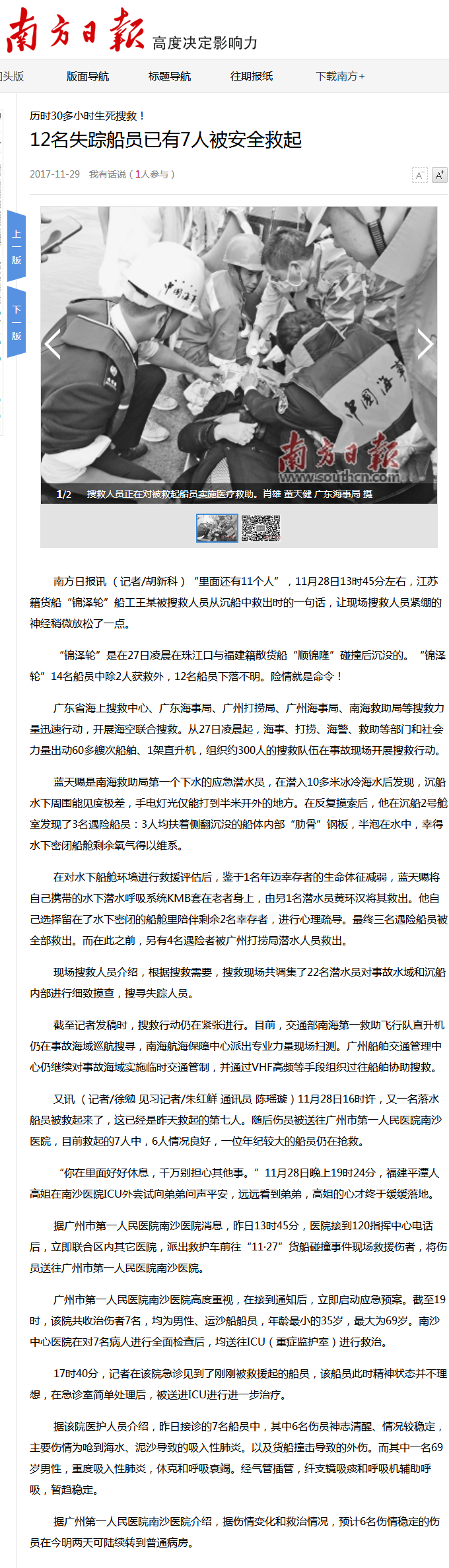 《南方日报》:12名失踪船员已有7人被安全救起 2017年11月29日A11版