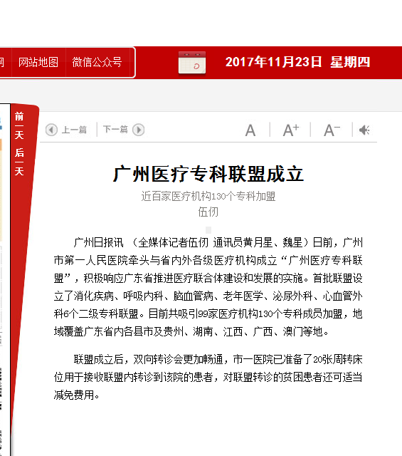 《广州日报》:广州医疗专科联盟成立 2017年11月23日A23版