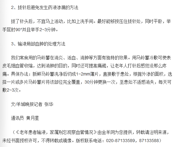 《羊城晚报》:老年患者输液,家属别忘观察血管情况 2017年12月12日B02
