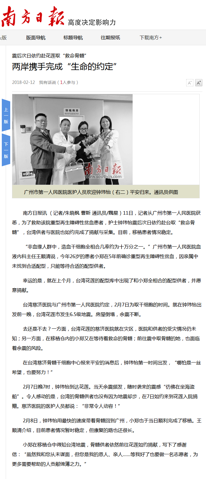 《南方日报》:两岸携手完成“生命的约定” 2018年2月12日A11版