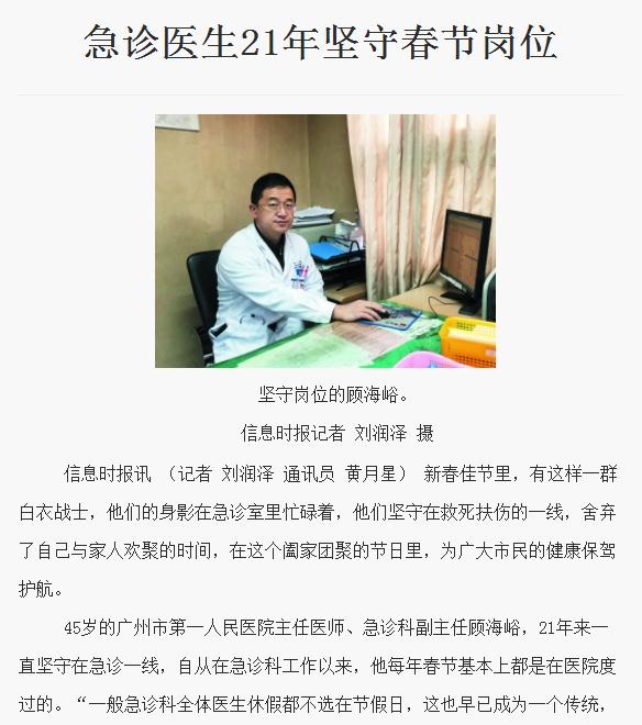 《信息时报》:急诊医生21年坚守春节岗位 2018年2月18日A3版