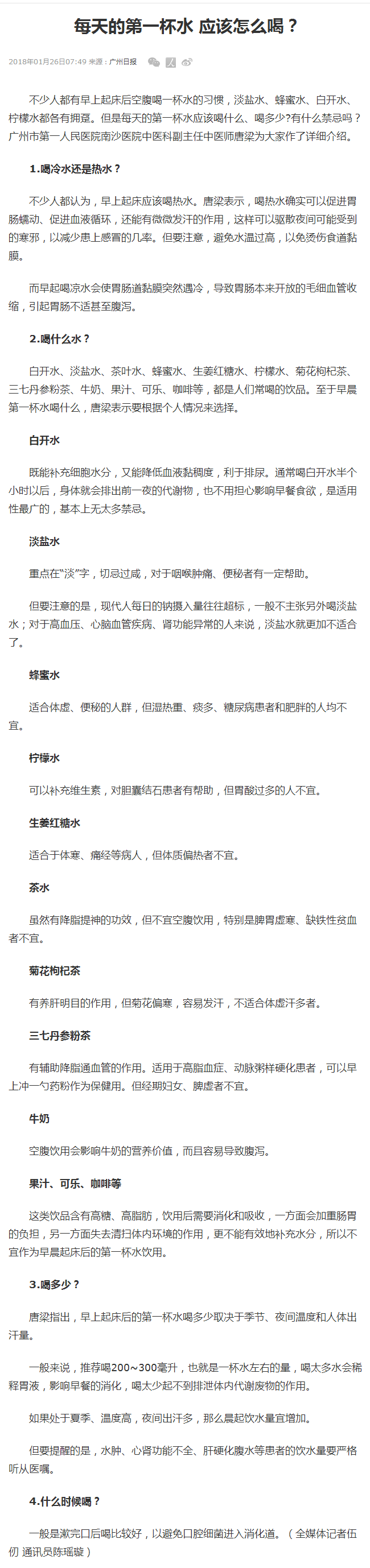 《广州日报》:每天的第一杯水 应该怎么喝? 2018年1月26日A18版