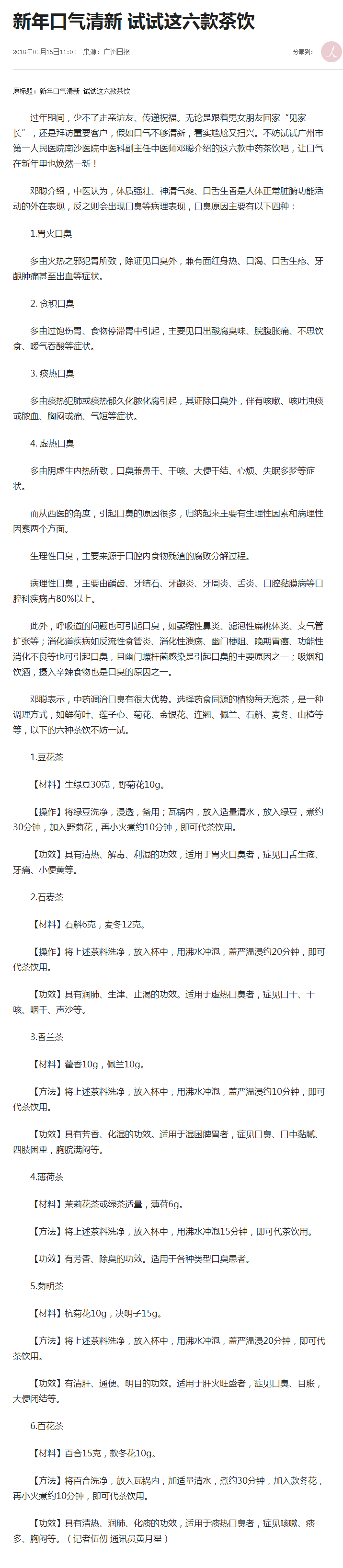 《广州日报》:新年口气清新 试试这六款茶饮 2018年2月15日A10版