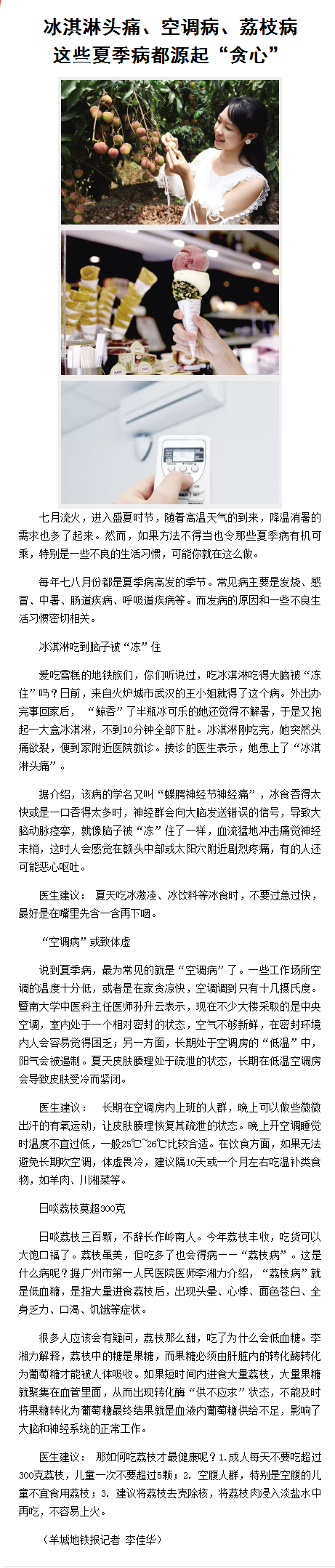 《羊城地铁报》:冰淇淋头痛、空调病、荔枝病 这些夏季病都源起“贪心” 2018年7月2日A6版