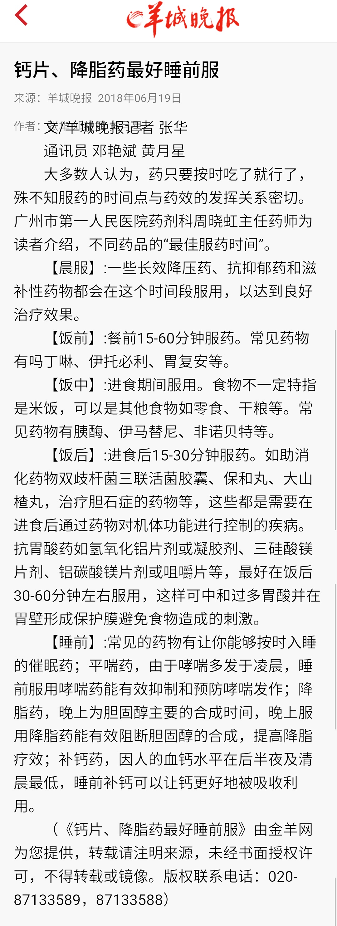 《羊城晚报》:钙片、降脂药最好睡前服 2018年6月19日A12G版