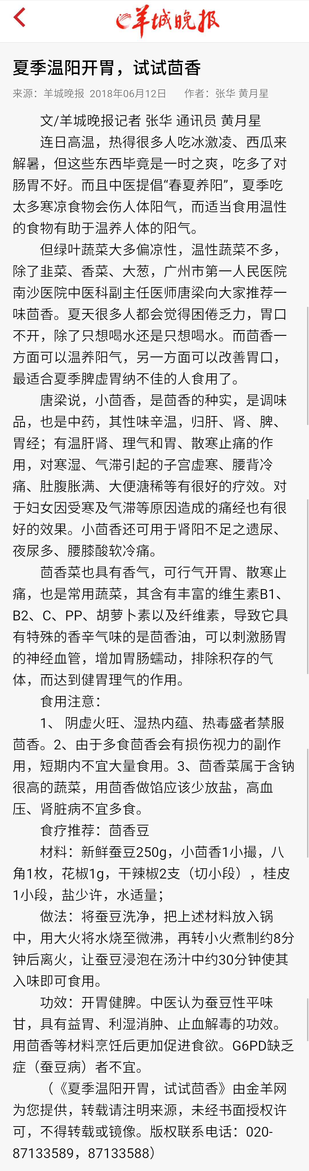 《羊城晚报》:夏季温阳开胃,试试茴香 2018年6月12日A19版