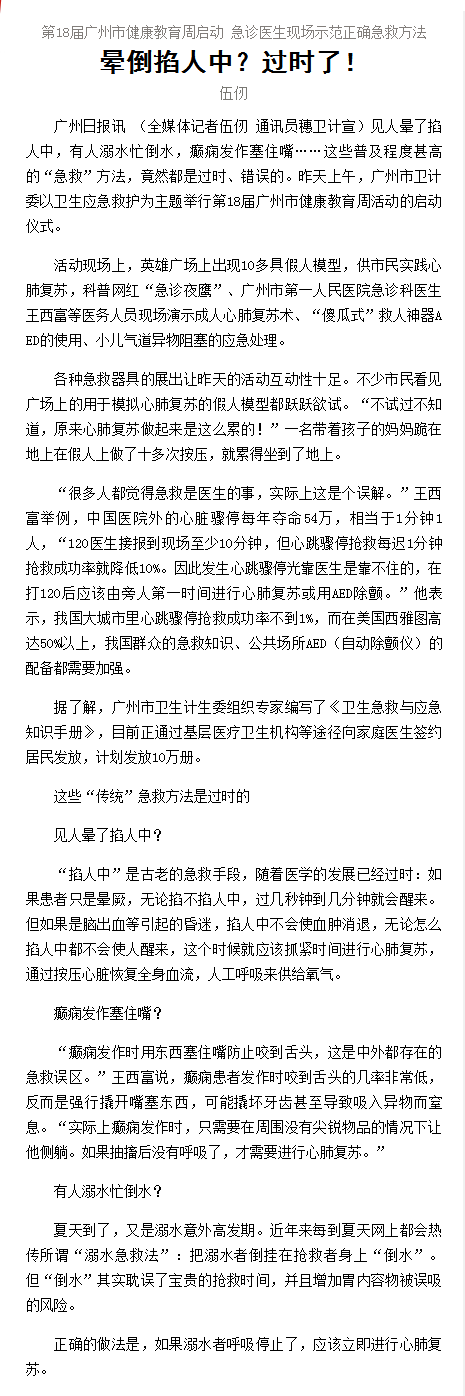 《广州日报》:晕倒掐人中?过时了! 2018年7月22日A4版