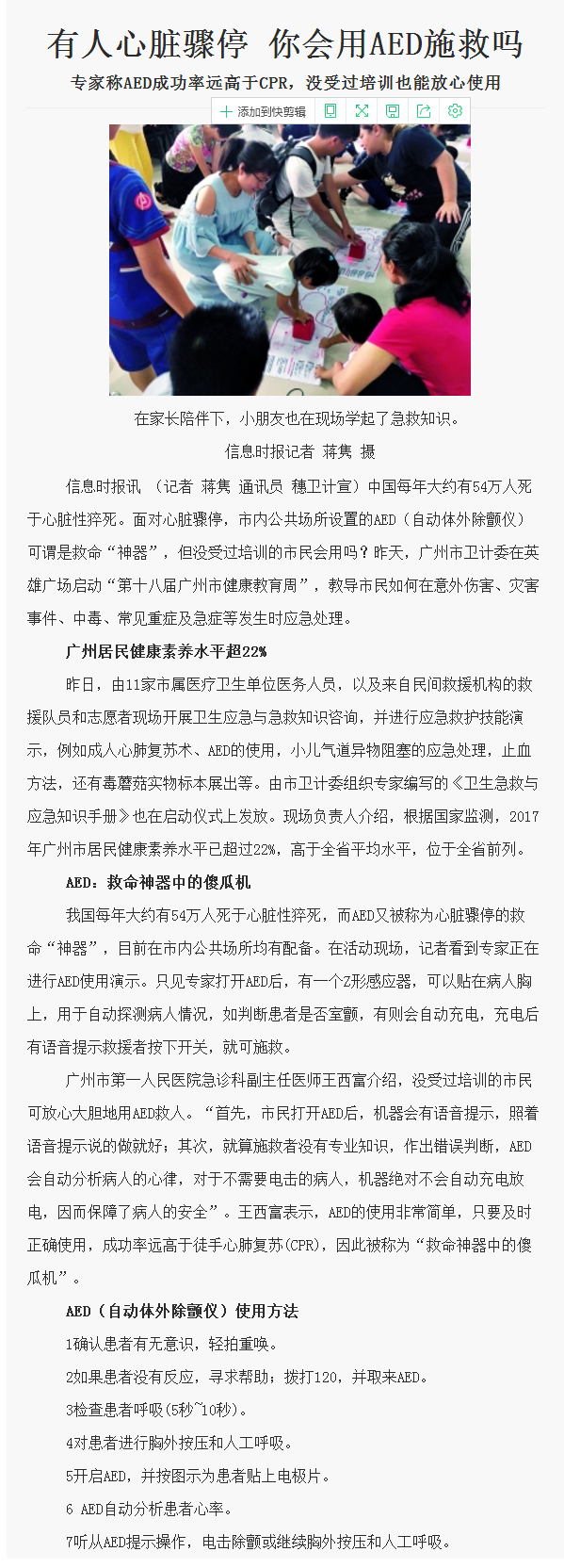 《信息时报》:有人心脏骤停 你会用AED施救吗 2018年7月22日A5版