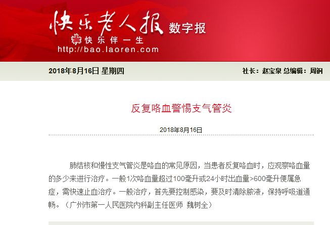 《快乐老人报》:反复咯血警惕支气管炎 2018年8月16日09版