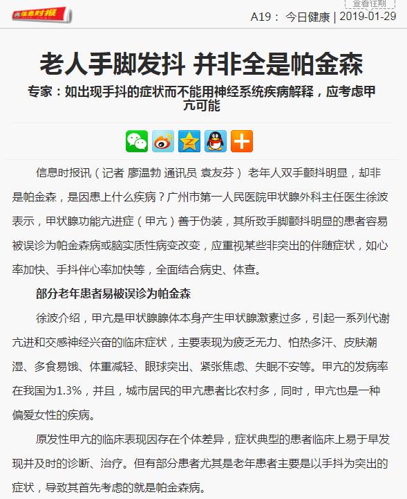 《信息时报》:老人手脚发抖 并非全是帕金森 2019年1月29日A19版