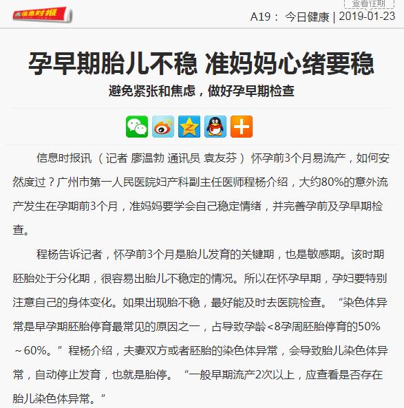 《信息时报》:孕早期胎儿不稳 准妈妈心绪要稳 2019年1月23日A19版