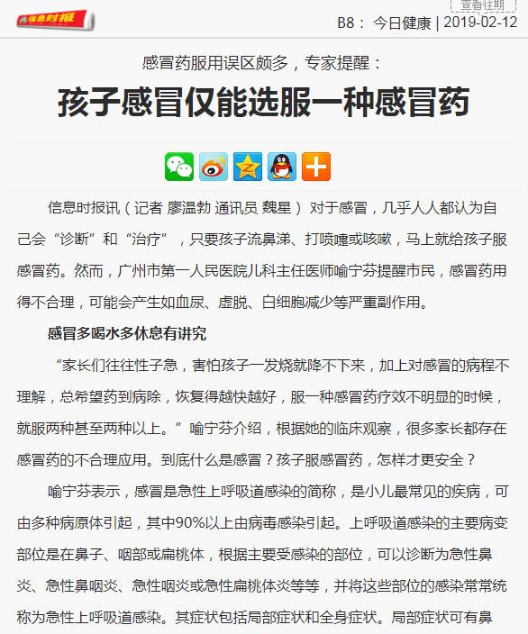 《信息时报》:孩子感冒仅能选服一种感冒药 2019年2月12日B8版