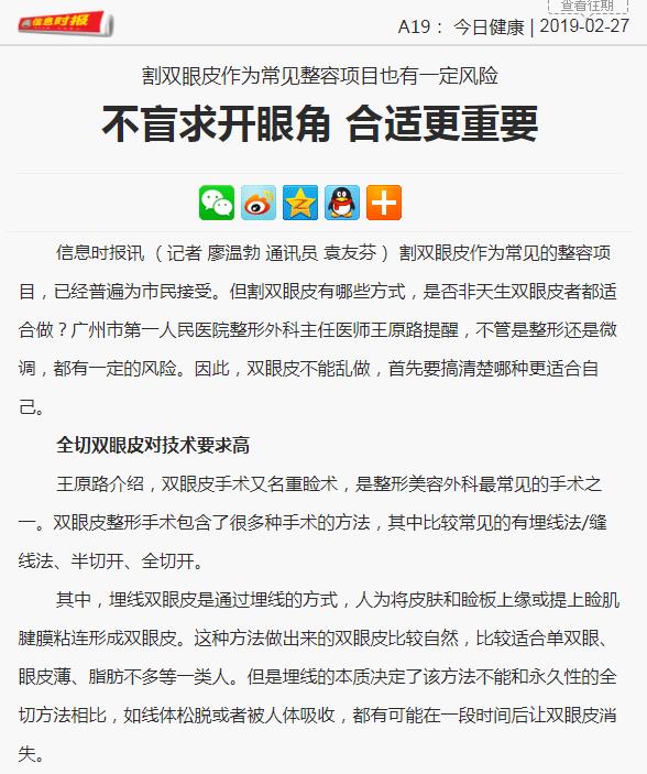 《信息时报》:不盲求开眼角 合适更重要 2019年2月27日A19版