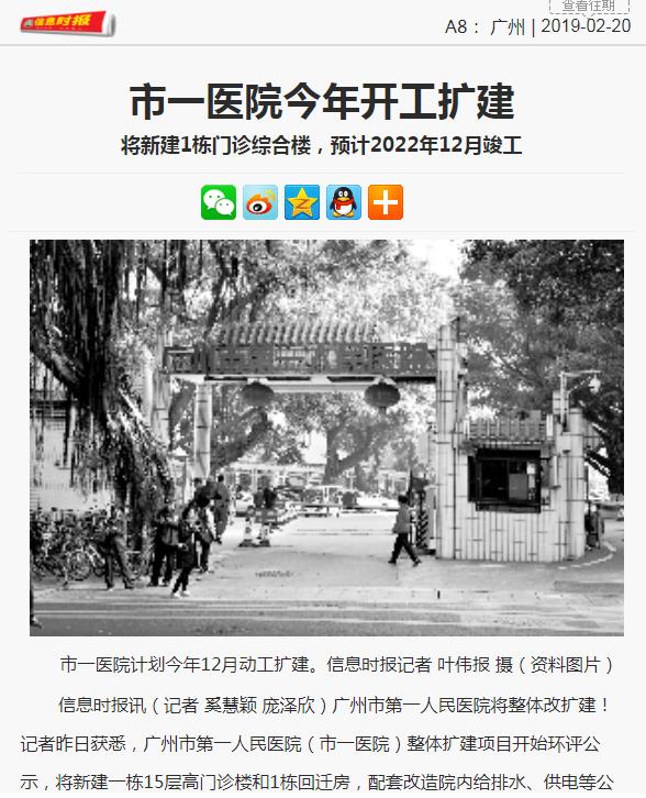 《广州日报》:市一医院年底改扩建 新建十五层高门诊楼 2019年2月20日A8版