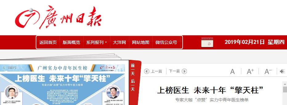 《广州日报》:上榜医生 未来十年“擎天柱” 2019年2月21日A6版