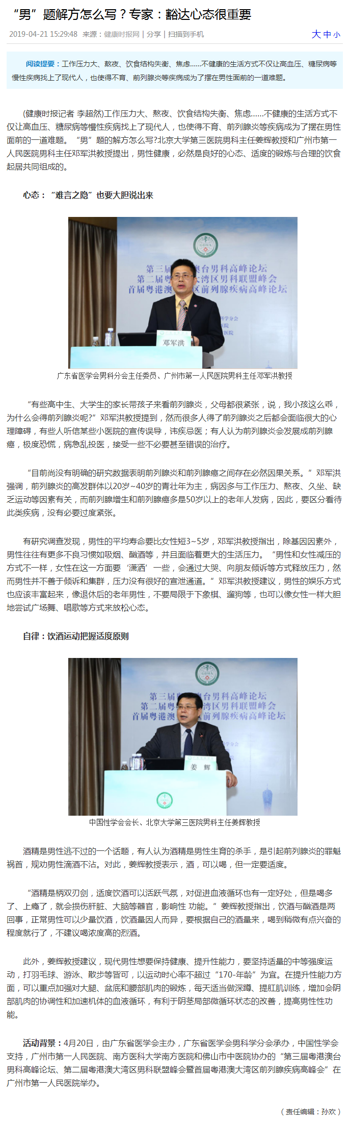 《健康时报网》:“男”题解方怎么写?专家:豁达心态很重要 2019年4月21日